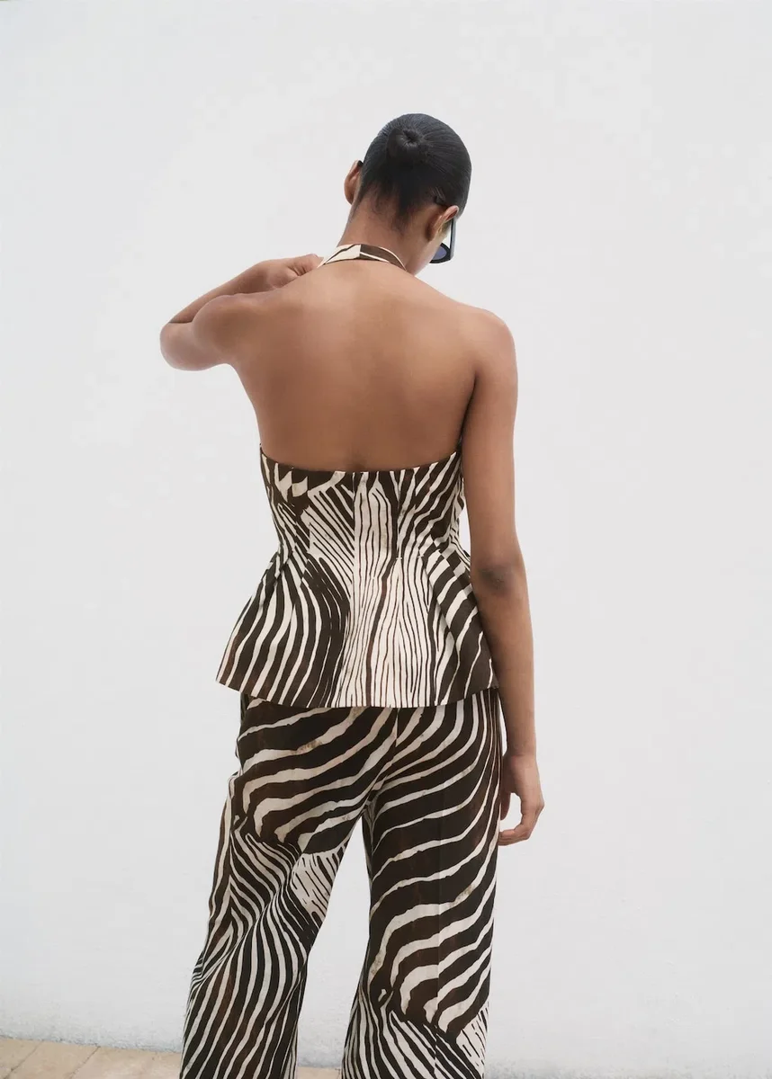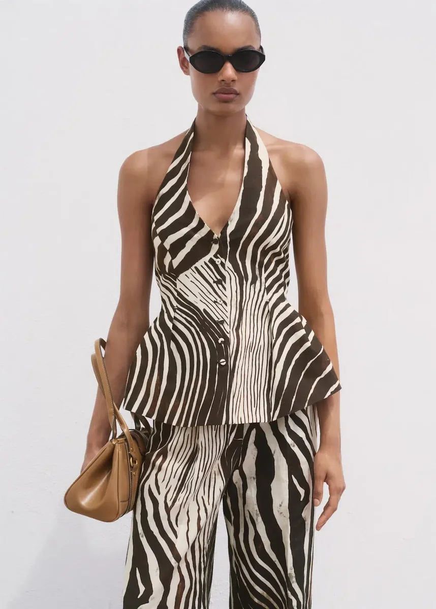 Realizzato in tessuto misto lino e cotone, questo gilet presenta un taglio peplo con stampa zebrata. Il suo design include un collo all’americana e spalline sottili. È abbinato a pantaloni coordinati per un total look