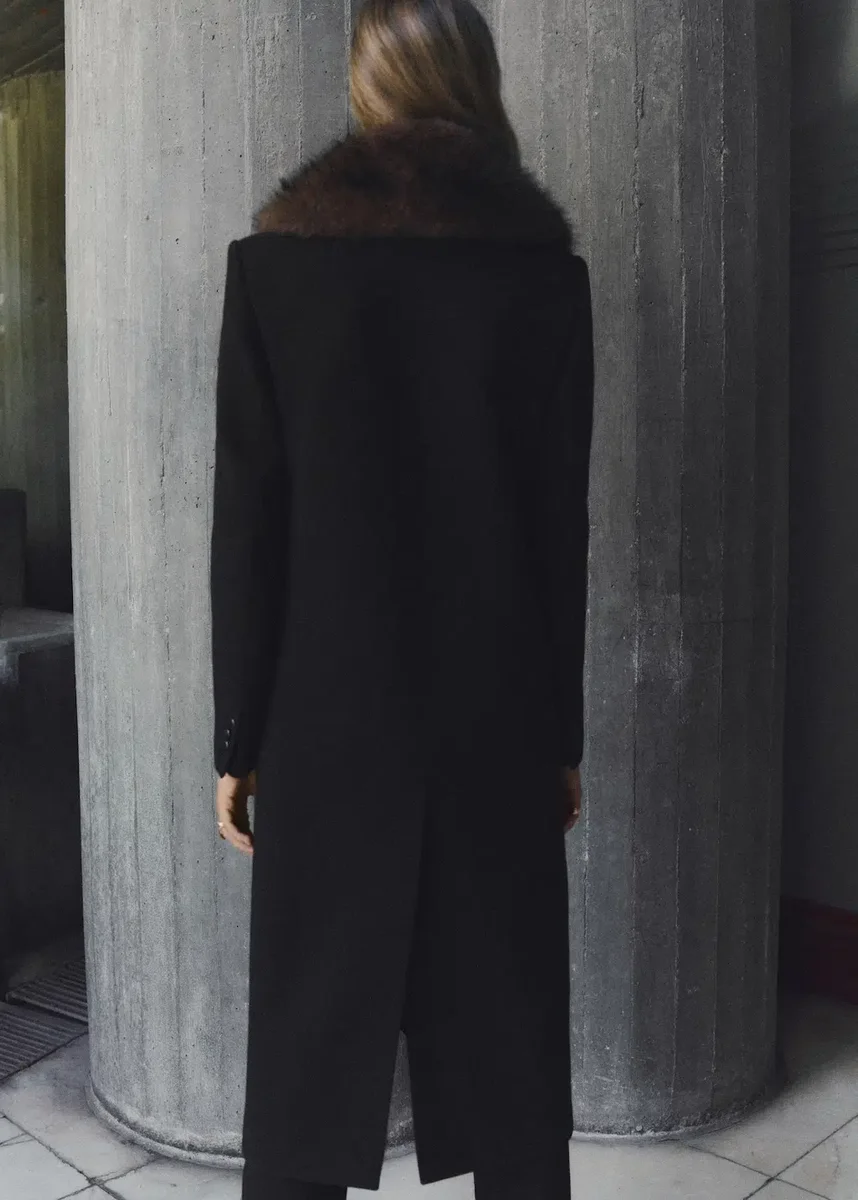 Tessuto misto lana. Modello lungo. Taglio dritto. Collo con revers e scollo a V. Collo staccabile effetto pelliccia. Maniche lunghe con polsini abbottonati. Due tasche con patta sul davanti. Chiusura frontale con bottoni. Fodera interna