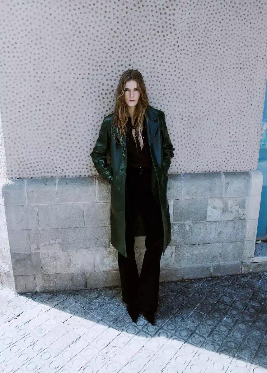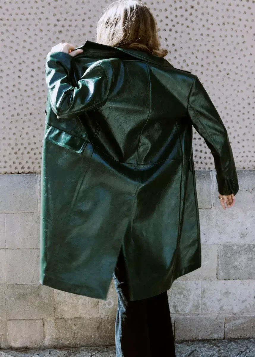 Realizzato in tessuto similpelle, questo modello lungo e dritto presenta un elegante scollo a V con revers. Ha maniche lunghe, due tasche con patta sul davanti e chiusura frontale con bottoni. Fodera interna