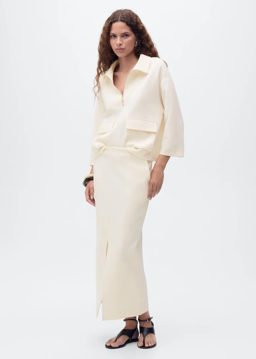 Tessuto in cotone. Modello dritto. Collo con revers a V. Collo a imbuto. Maniche a tre quarti. Due tasche con patta sul davanti. Dimensioni: 28,5x8x2 cm. Total look