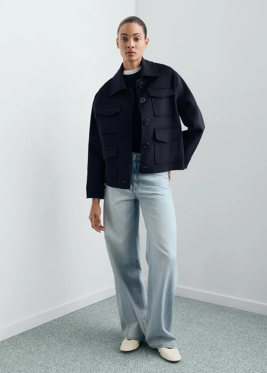 Tessuto misto lana. Modello dritto. Modello medio. Collo camicia. Maniche lunghe. Quattro tasche applicate sul davanti. Chiusura con bottoni sul davanti.