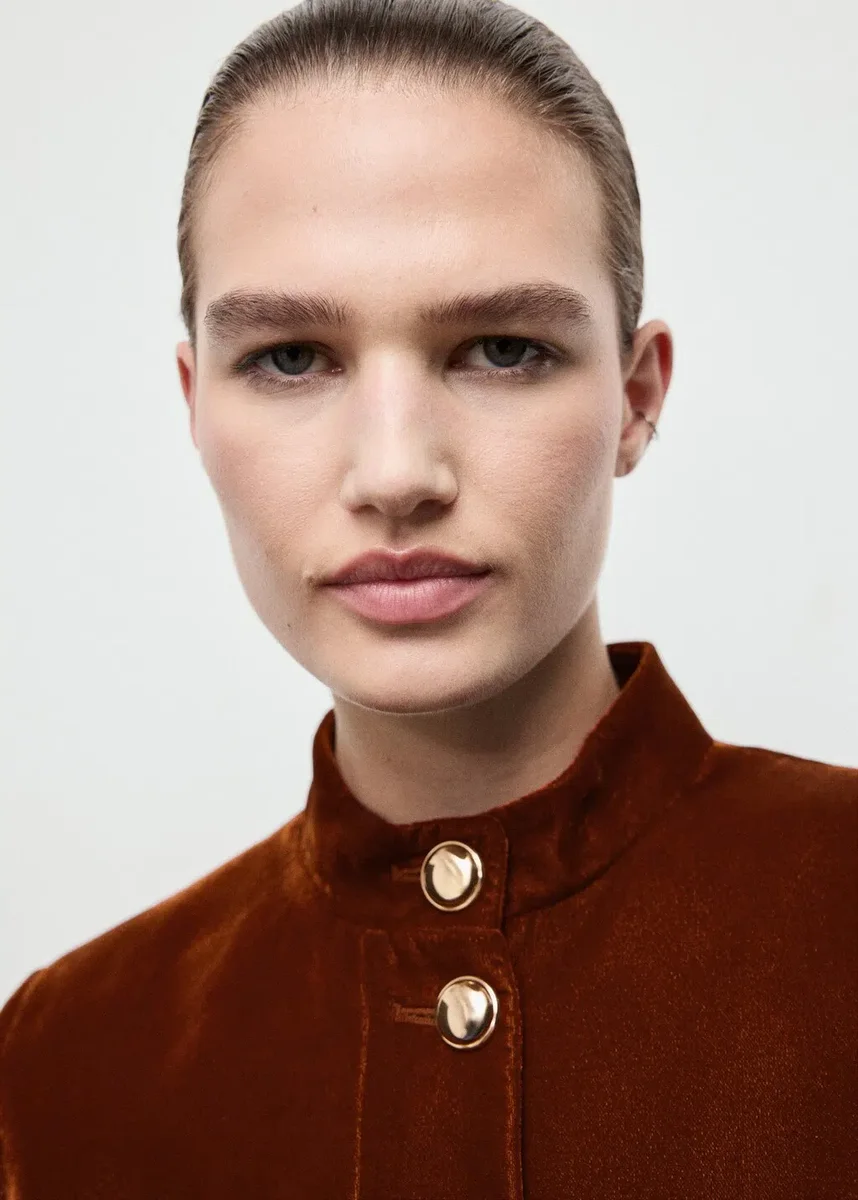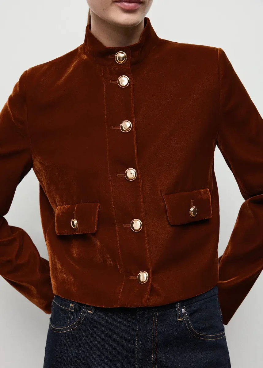 Tessuto in velluto. Modello corto. Design dritto. Collo alto. Maniche lunghe. Due tasche con patta e bottone sul davanti. Chiusura con bottoni sul davanti. Fodera interna. Questo capo fa parte della nostra collezione party ed eventi, pensata per valorizzare il tuo look nelle occasioni speciali.