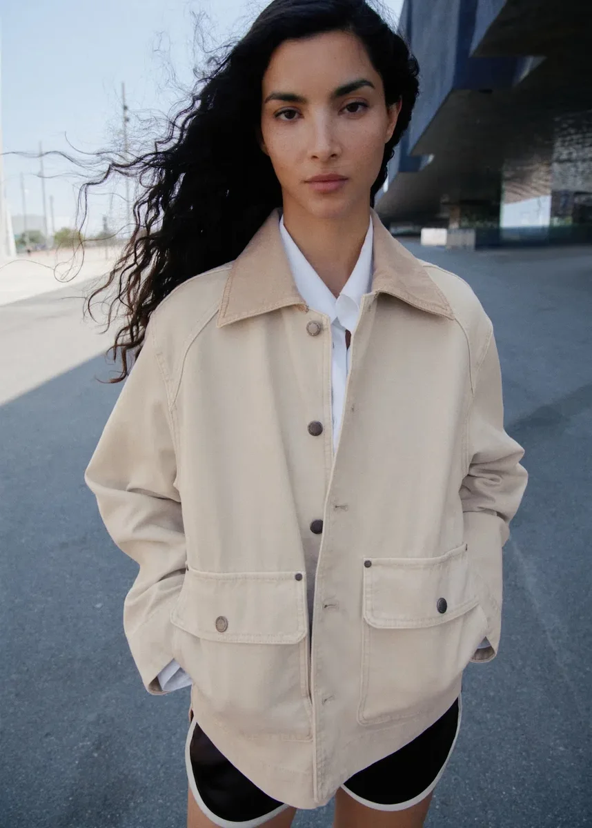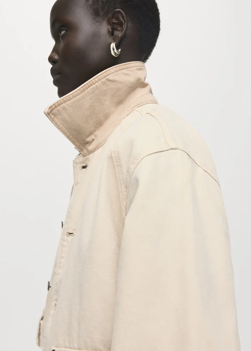Tessuto denim di cotone. Design dritto. Colletto stile camicia a contrasto. Maniche lunghe. Due tasche con patta. Chiusura con bottoni sul davanti. Fodera interna.