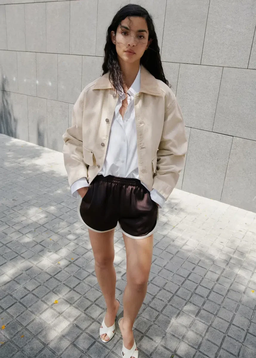 Tessuto denim di cotone. Design dritto. Colletto in stile camicia a contrasto. Maniche lunghe. Due tasche con patta. Chiusura con bottoni sul davanti. Fodera interna.