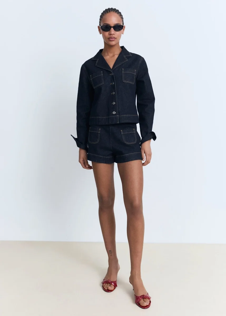 Tessuto denim di cotone. Vestibilità aderente. Modello corto. Collo con revers a V. Revers classico. Maniche lunghe con polsini abbottonati. Due tasche applicate sul petto. Chiusura frontale con bottoni. Total look. Tessuto confortevole ed elastico. Black Friday.
