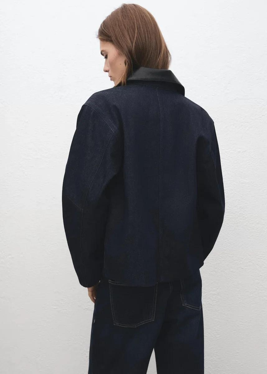Tessuto denim di cotone. Design dritto. Colletto camicia in ecopelle. Maniche lunghe. Tasca applicata sul petto. Due tasche applicate e tasche con patta sul davanti. Chiusura con bottoni sul davanti. Total look