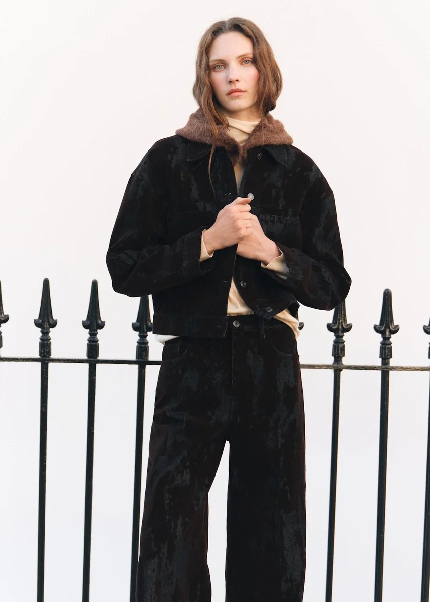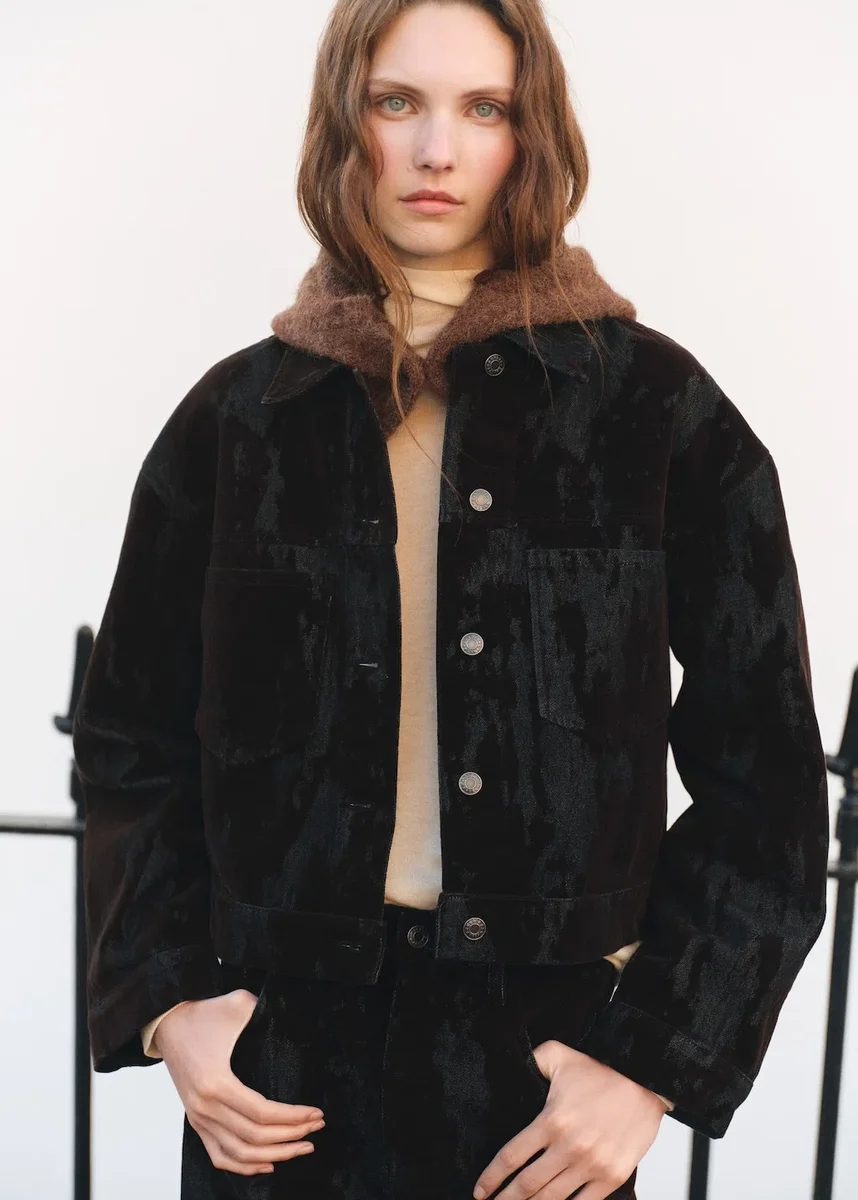 Tessuto devoré. Design dritto. Colletto camicia. Maniche lunghe. Due tasche applicate sul davanti. Chiusura frontale con bottoni. Total look