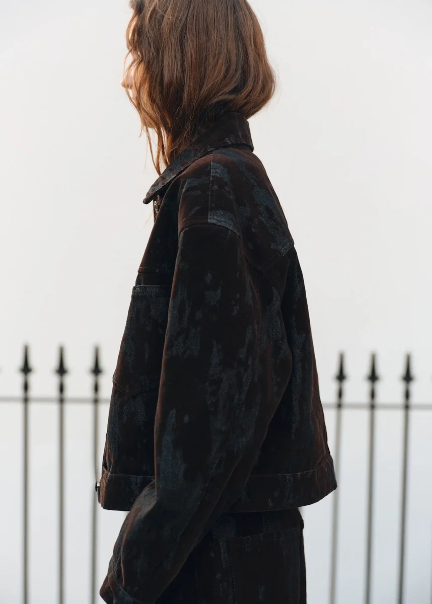 Tessuto devoré. Design dritto. Colletto camicia. Maniche lunghe. Due tasche applicate sul davanti. Chiusura frontale con bottoni. Total look.