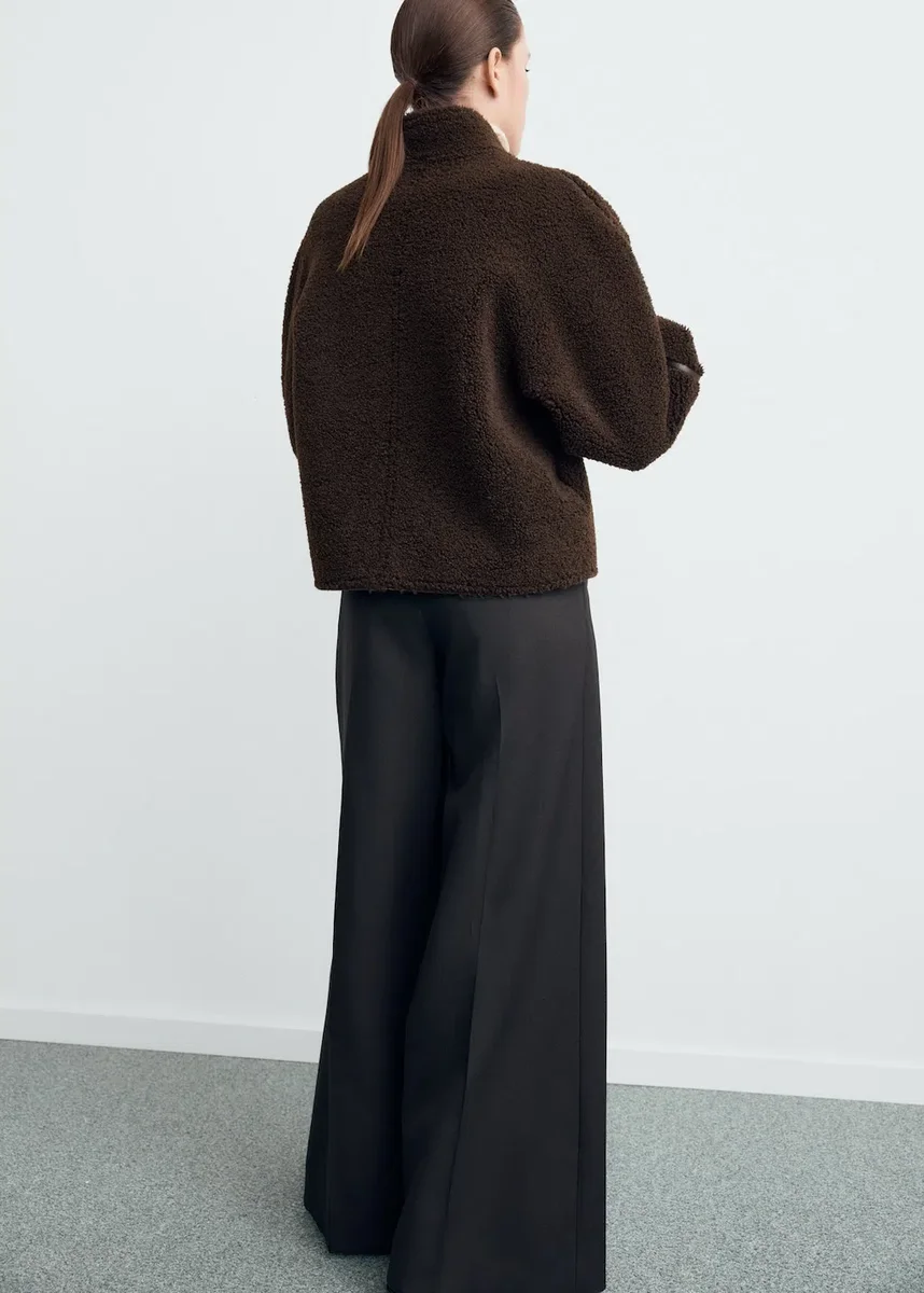 Tessuto sherpa. Design reversibile. Design oversize. Design dritto. Collo alto. Maniche lunghe. Chiusura frontale con bottoni