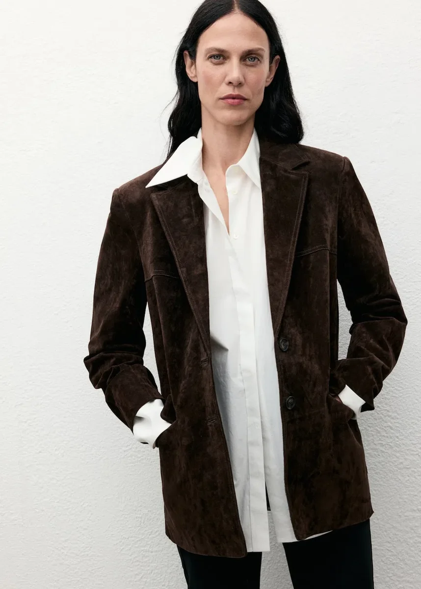 100% pelle scamosciata. Design dritto. Collo con revers a V. Revers classici. Maniche lunghe con polsini abbottonati. Due tasche laterali con patta. Chiusura con bottoni sul davanti. Fodera interna. Esclusiva online