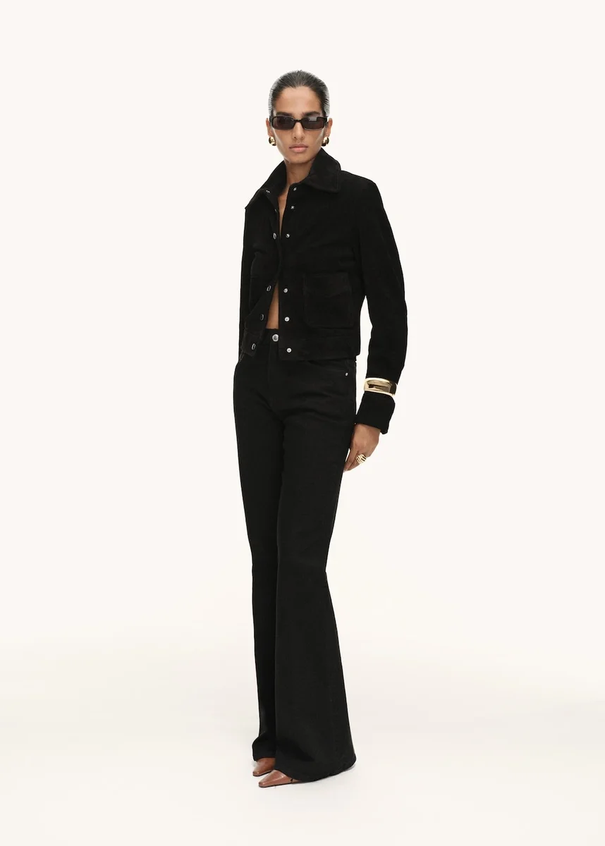 100% pelle bovina. Pelle scamosciata. Modello corto. Modello dritto. Collo camicia. Maniche lunghe. Due tasche applicate e tasche frontali con patta. Chiusura frontale con bottoni. Fodera interna