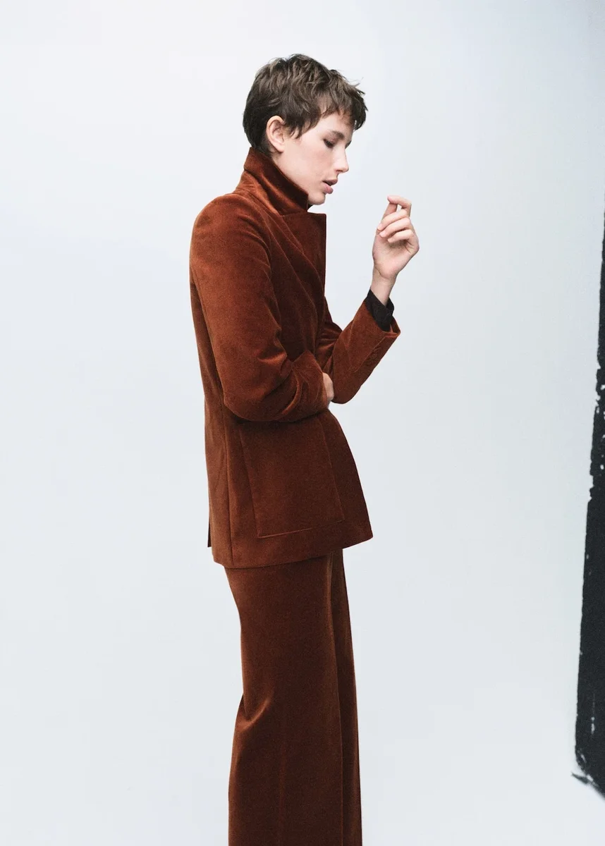 Modello giacca. Tessuto in velluto. Design dritto. Collo con revers e scollo a V. Revers classico. Maniche lunghe con polsini abbottonati. Due tasche applicate sul davanti. Chiusura frontale con bottoni. Fodera interna. Total look