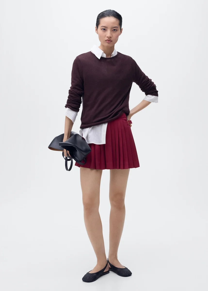 Con un design corto e plissettato, questo capo presenta un taglio a vita media completato da fibbie decorative.