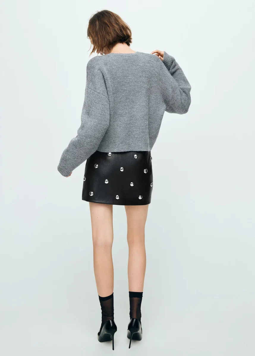 Con una finitura in ecopelle e un design corto, questa gonna dritta si distingue per le sue decorazioni con borchie. Presenta una chiusura con zip laterale e una fodera interna. Questo capo fa parte della nostra collezione party ed eventi, pensata per valorizzare i tuoi outfit nelle occasioni speciali
