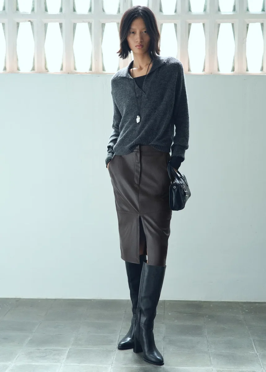 Con finitura in ecopelle, questa gonna presenta un design corto a tubino con vita media. Include due tasche laterali e una chiusura nascosta con bottone, gancio e cerniera. Lo spacco frontale sull’orlo completa il suo stile. Disponibile in taglie forti