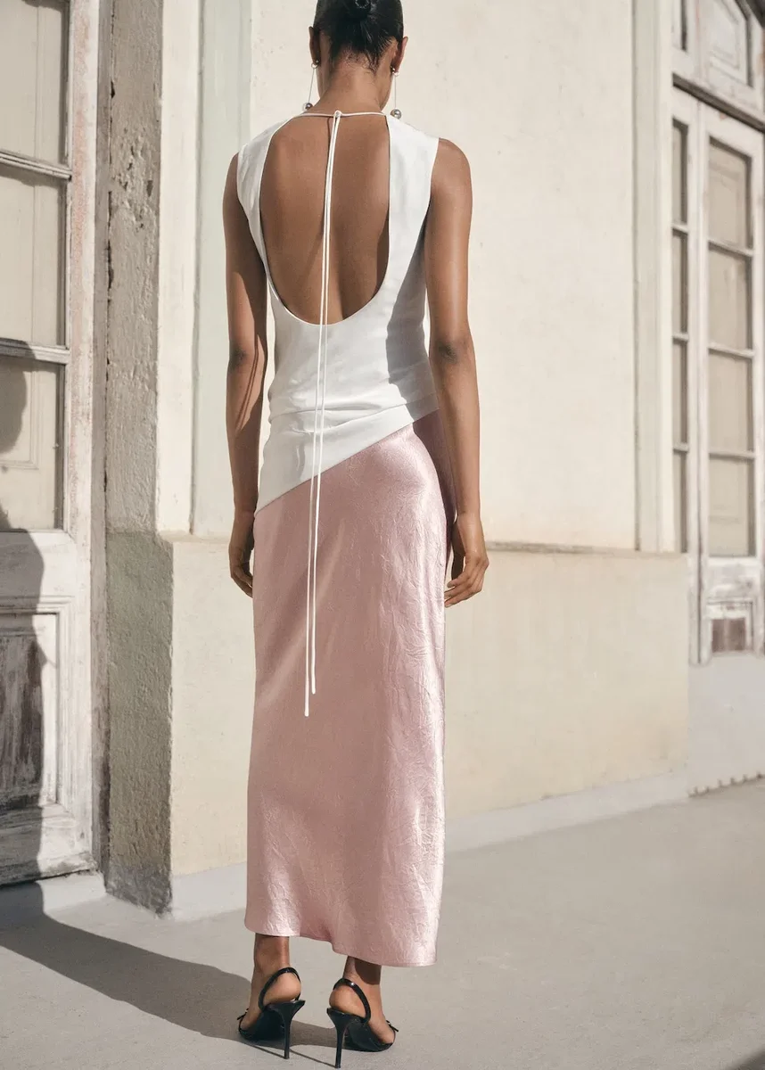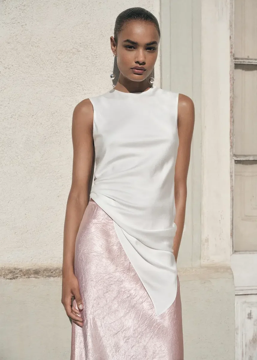 Realizzata in tessuto di raso stropicciato, questa gonna presenta un design midi e dritto. La vita media ed elasticizzata garantisce il massimo comfort. È abbinata a una blusa coordinata per un total look perfetto. Disponibile in taglie forti