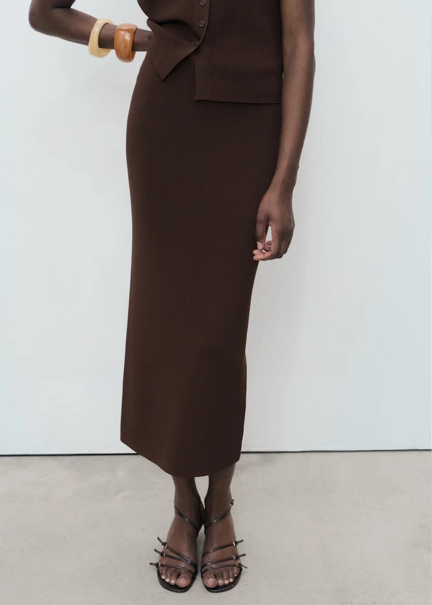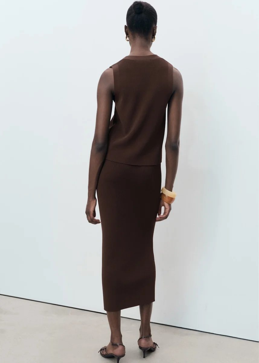 Realizzata in tessuto a maglia fine, questa gonna presenta un design dritto e una vita media. Abbinata a un gilet coordinato, è l’ideale per un look coordinato. Disponibile nelle taglie forti