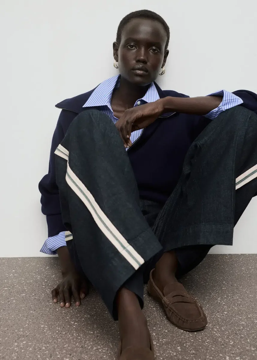 Tessuto denim di cotone. Modello lungo. Gamba larga. Vita bassa. Passanti per cintura. Righe laterali. Chiusura con bottone, gancio e zip nascosti. Lunghezza interna 81,7 cm.