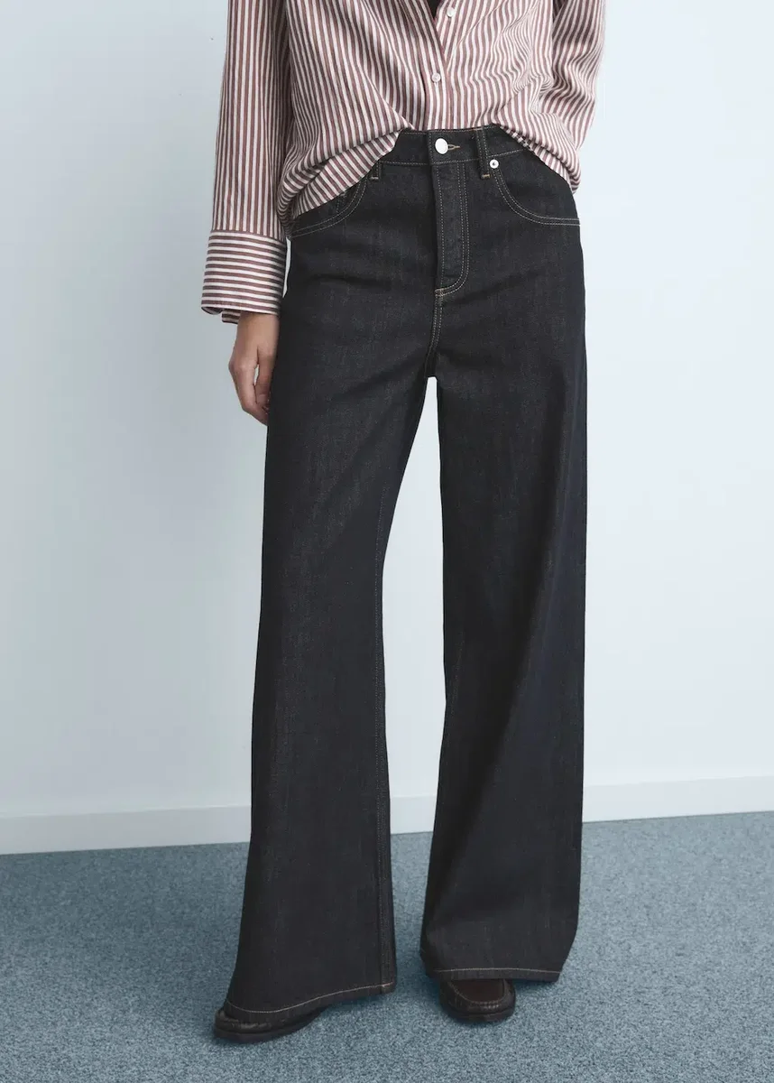 Tessuto denim di cotone. Modello lungo. Gamba larga. Vita media. Passanti per cintura. Cinque tasche. Chiusura frontale con bottoni. Lunghezza interna gamba 82 cm