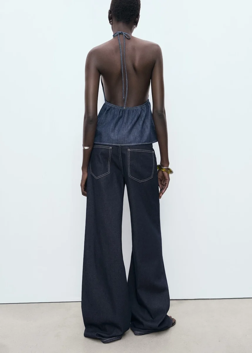 Tessuto denim di cotone. Modello lungo. Gamba larga. Vita bassa. Passanti per cintura. Cinque tasche. Chiusura con bottone e cerniera. Lunghezza interna 87,5 cm