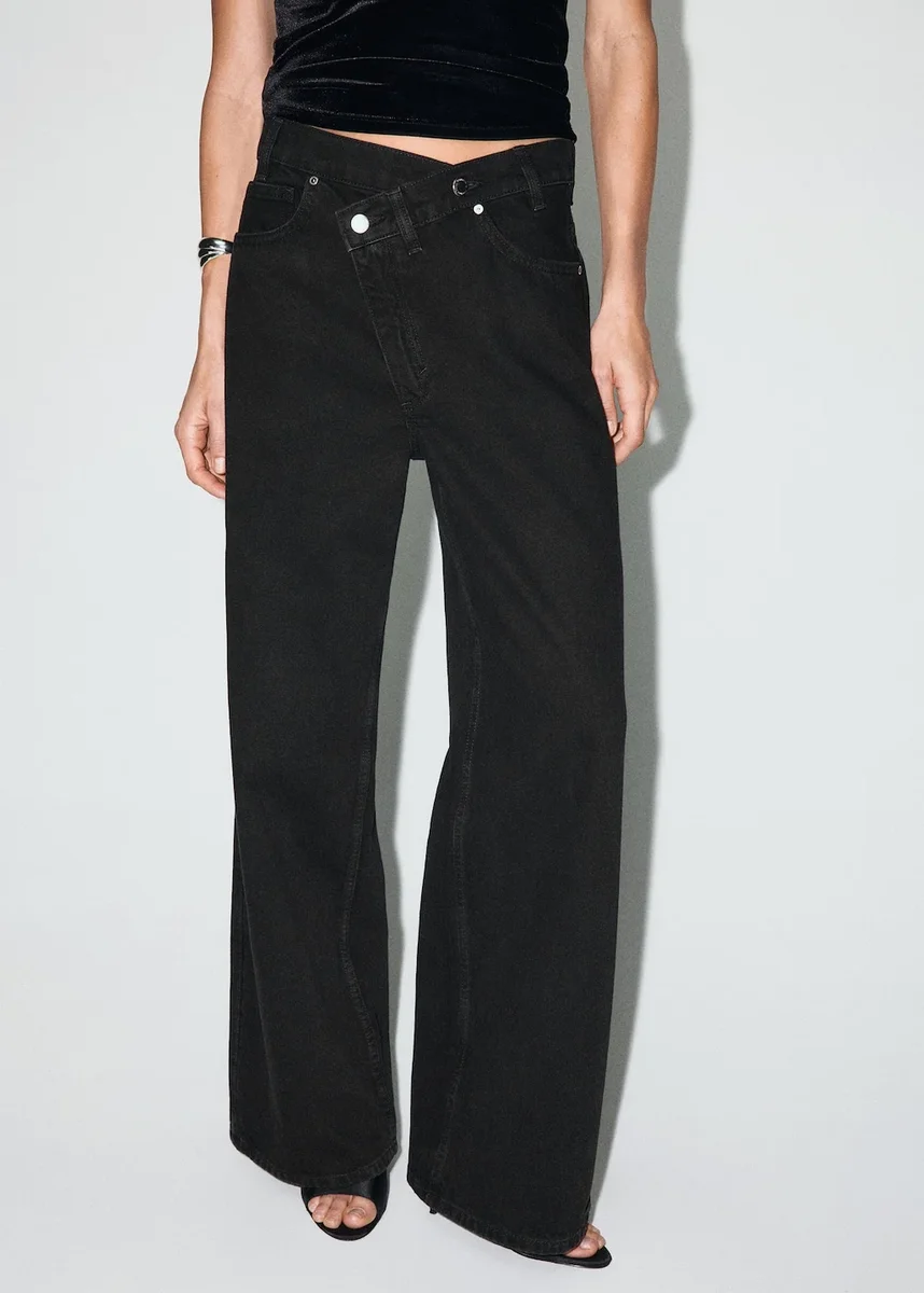 Tessuto denim di cotone. Modello lungo. Gamba larga. Vita media. Cintura avvolgente. Passanti per cintura. Cinque tasche. Chiusura frontale asimmetrica con zip e bottoni