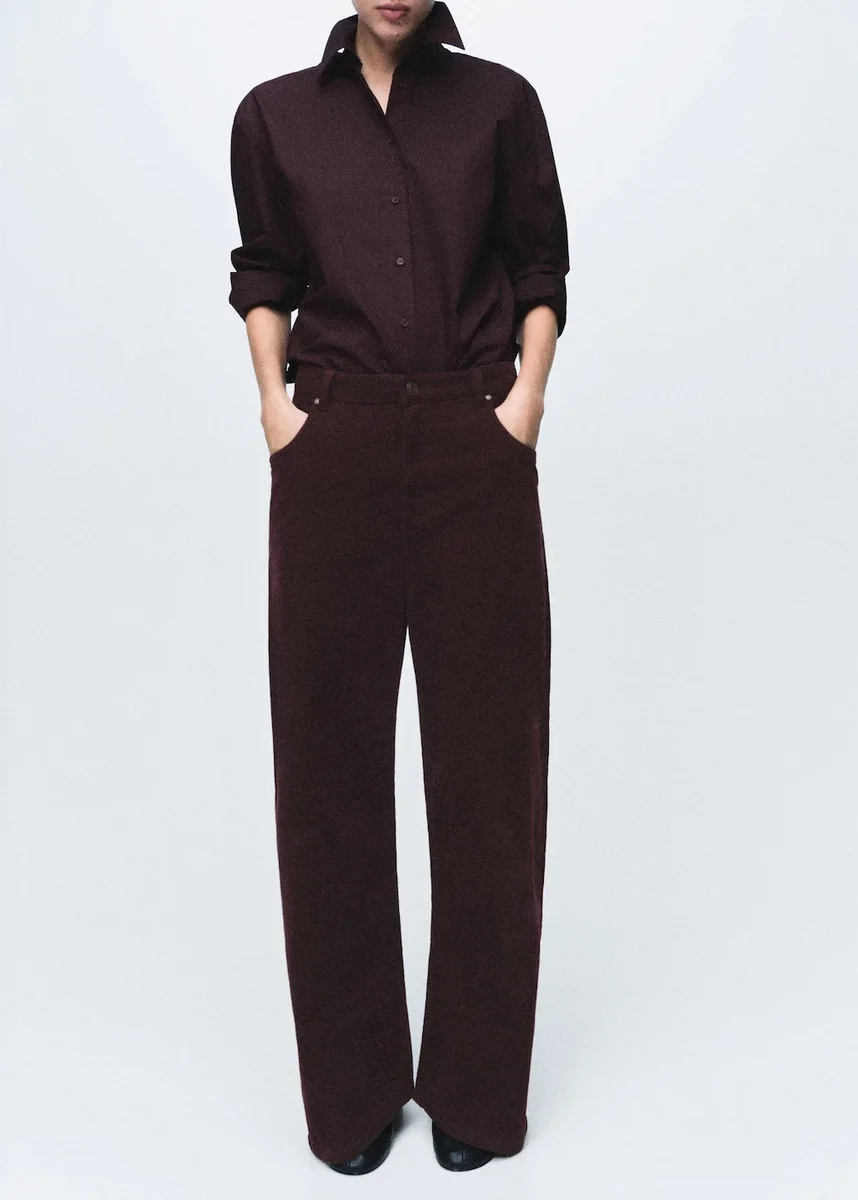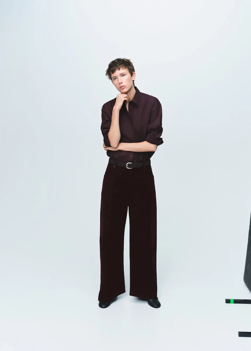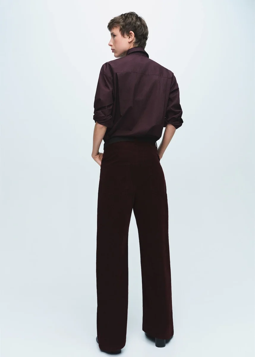 Tessuto in velluto a coste. Modello lungo. Gamba larga. Vita bassa. Passanti per cintura. Cinque tasche. Chiusura con bottone e cerniera. Tessuto confortevole ed elastico.