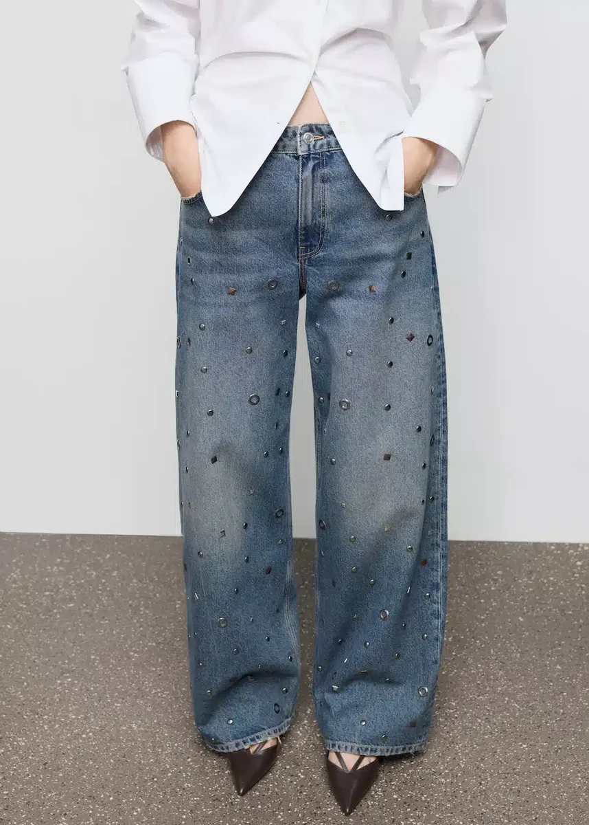 Tessuto denim di cotone. Design con occhielli. Modello lungo. Design dritto. Vita media. Passanti per cintura. Cinque tasche. Chiusura frontale con cerniera e bottone