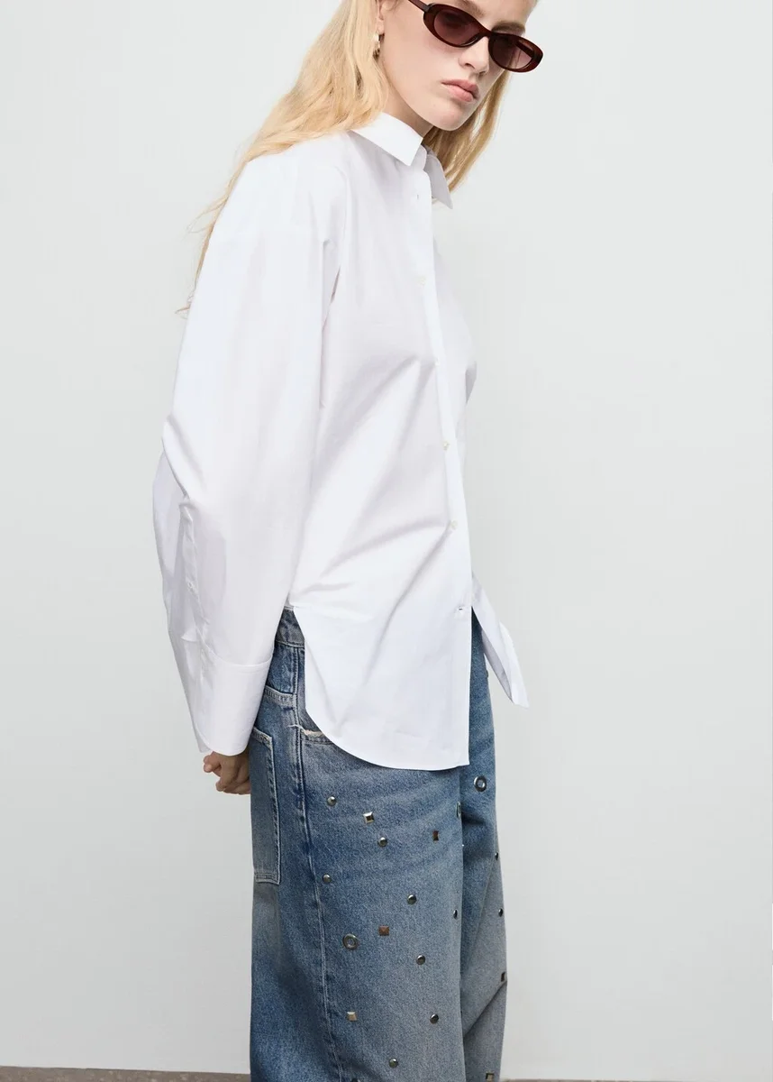 Tessuto denim di cotone. Design con occhielli. Modello lungo. Design dritto. Vita media. Passanti per cintura. Cinque tasche. Chiusura frontale con cerniera e bottone.
