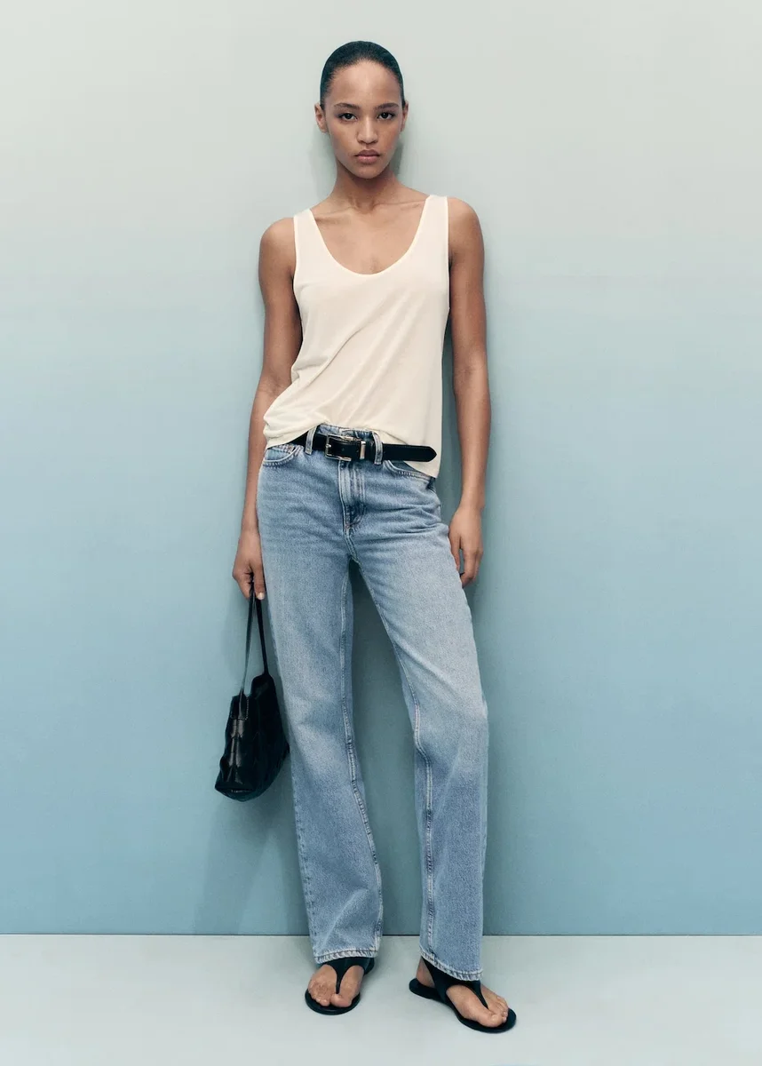 Tessuto denim di cotone. Modello lungo. Taglio dritto. Vita media. Passanti per cintura. Cinque tasche. Chiusura con zip e bottone. Lunghezza interna gamba 78 cm. Modello standard. Vita alta.