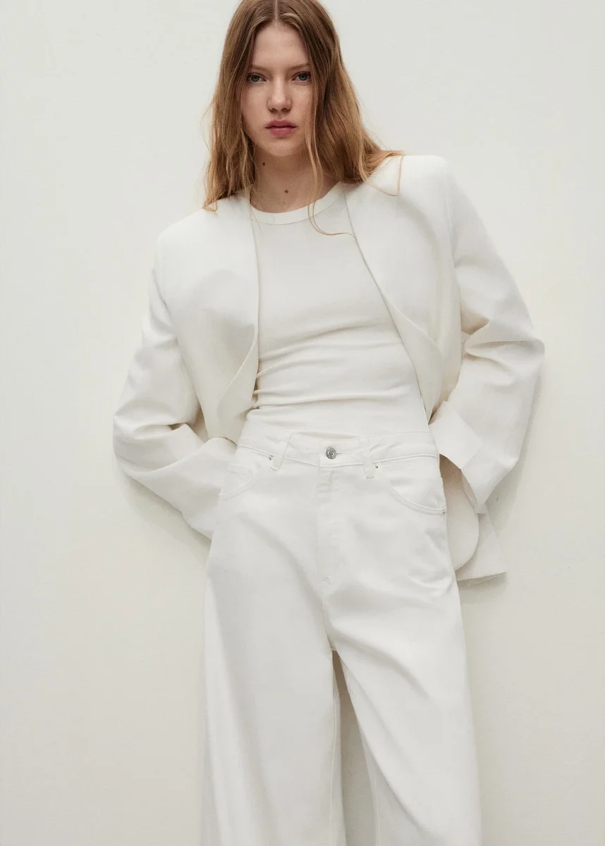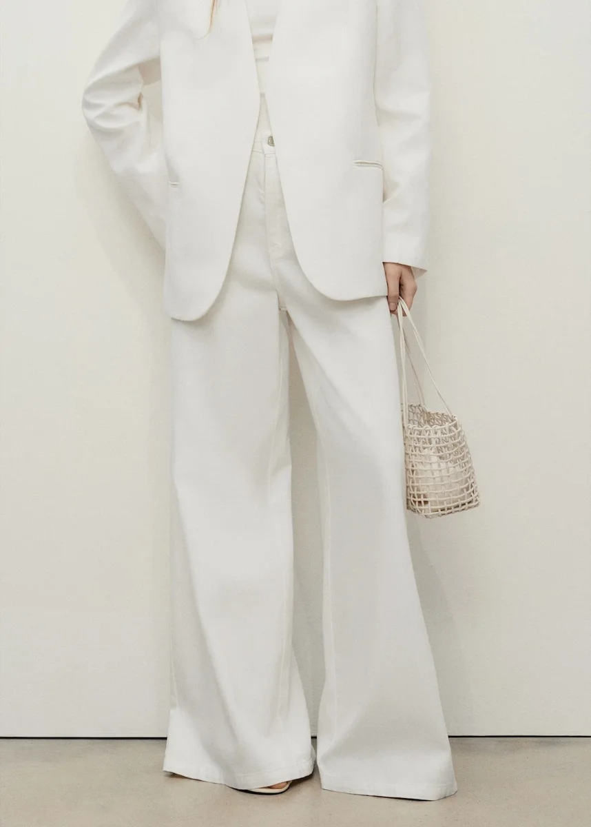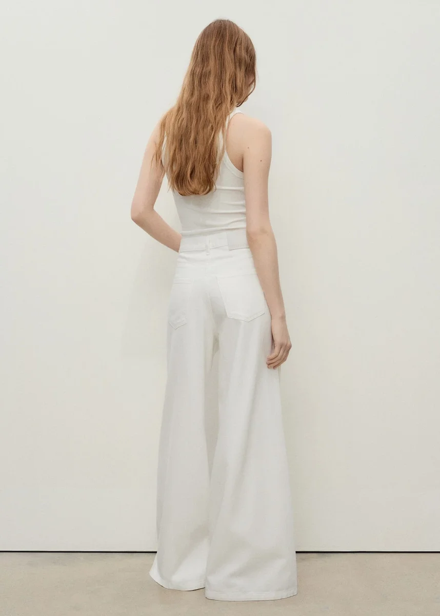 Tessuto denim di cotone. Design a gamba larga. Design lungo. Lunghezza intera. Vita alta. Passanti per cintura. Cinque tasche. Chiusura frontale con cerniera e bottone.