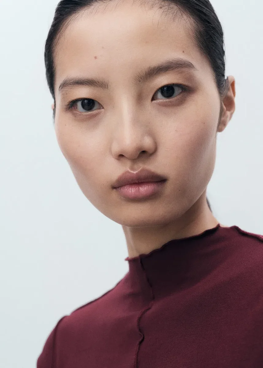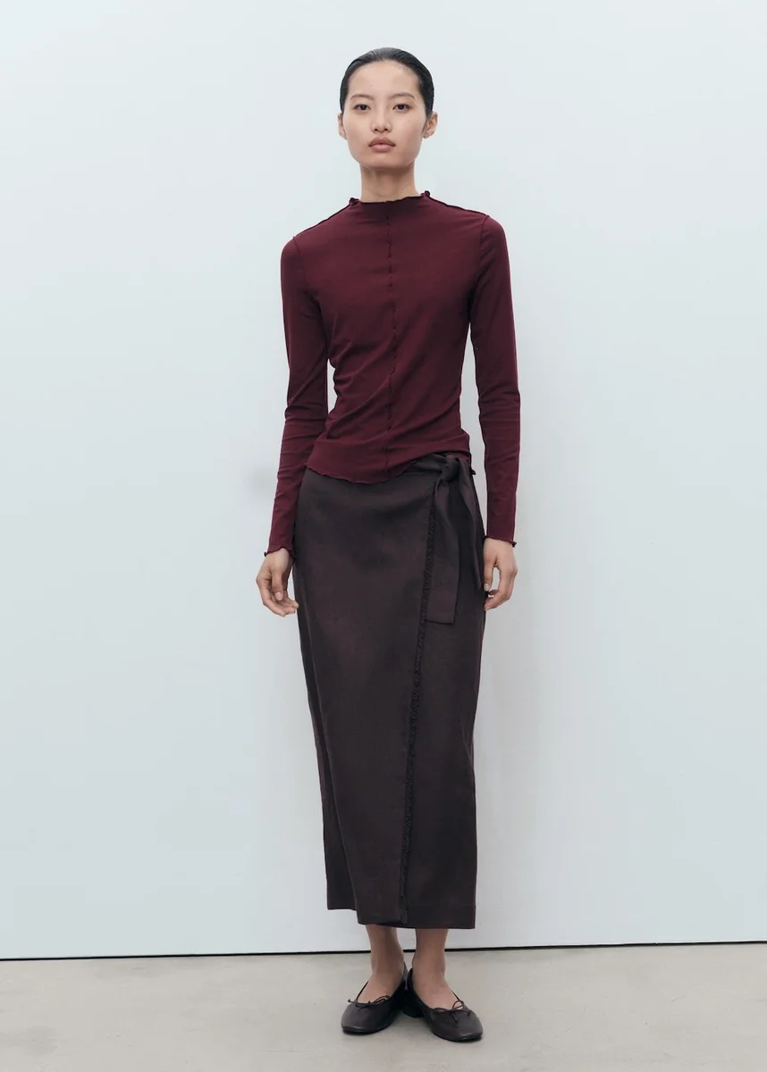 Caratterizzato da un design aderente, questo capo presenta un collo a imbuto e maniche lunghe. Le cuciture e i bordi smerlati gli conferiscono un tocco distintivo