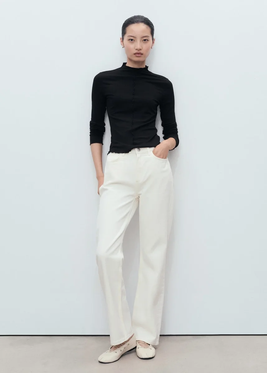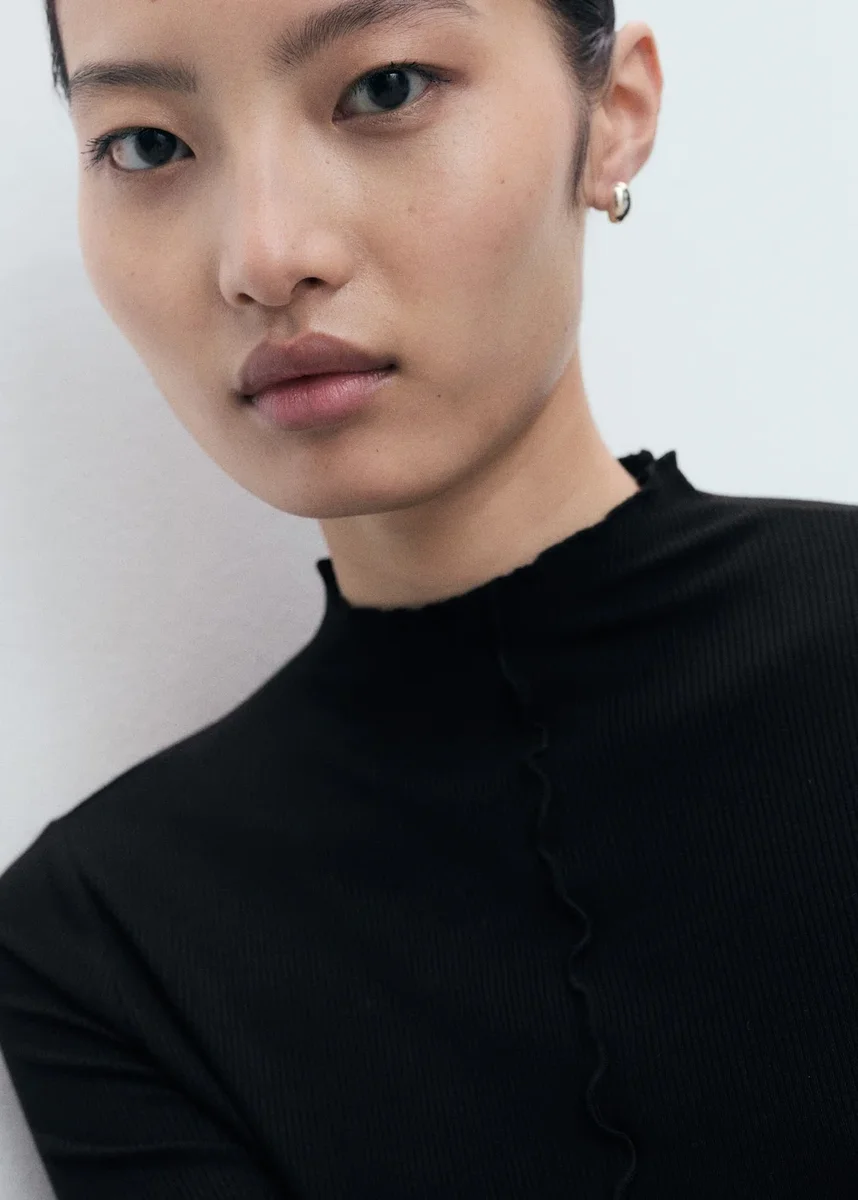Realizzato in tessuto a costine, questo capo presenta un design aderente con collo Perkins e maniche lunghe. Include dettagli cuciti e bordi smerlati.