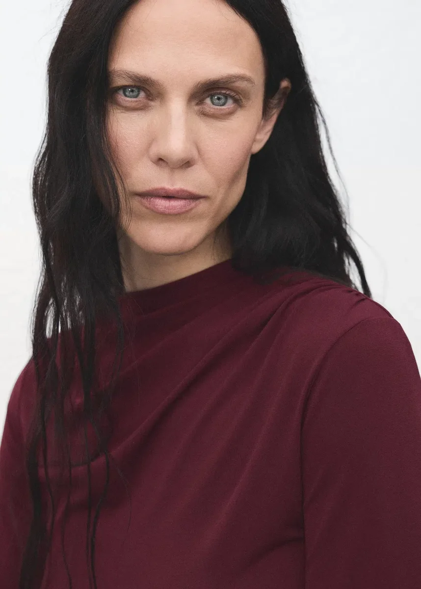 Con un design aderente, questo capo presenta una scollatura drappeggiata e maniche lunghe. Il dettaglio drappeggiato in vita gli conferisce un tocco distintivo. Disponibile in taglie forti