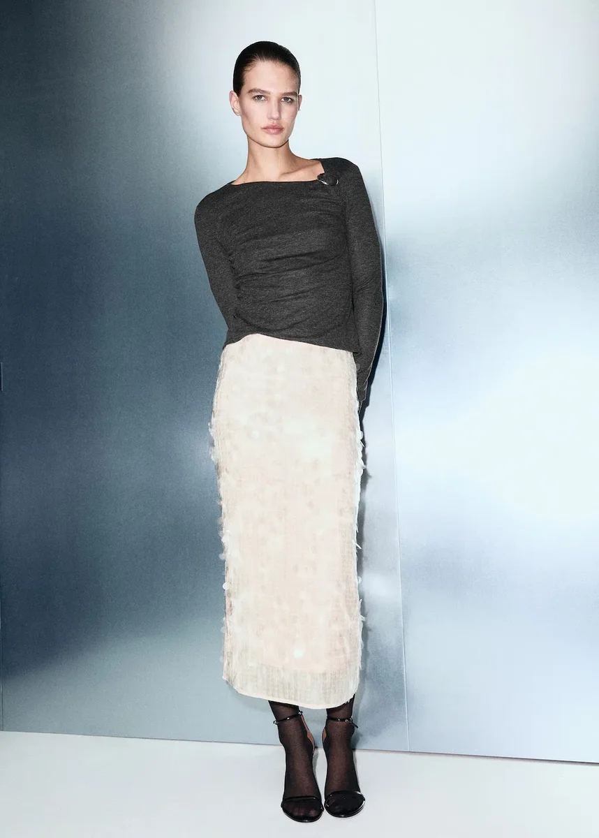 Design aderente. Scollo asimmetrico. Dettaglio anello in metallo. Maniche lunghe. Disponibile nelle taglie forti