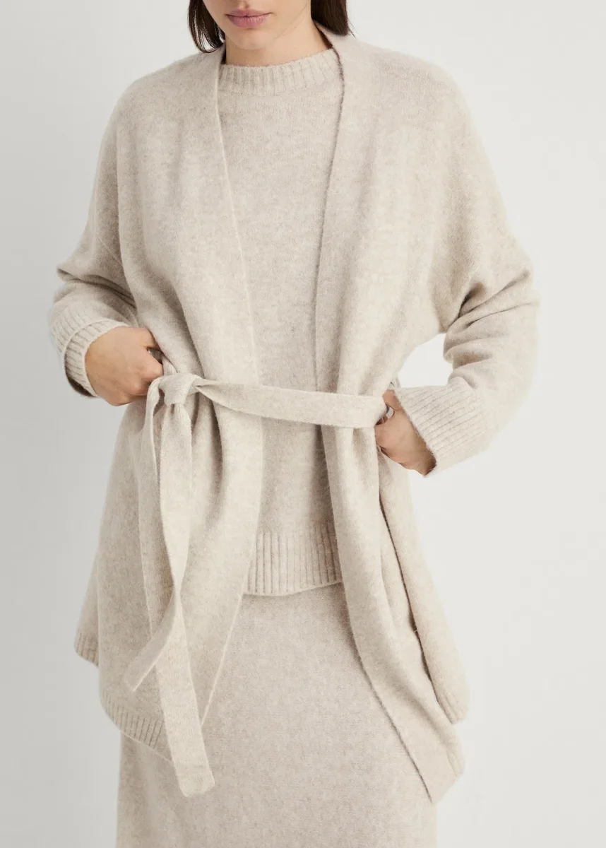 Midpoint. Design midi. Scollo a V incrociato. Maniche lunghe. Cintura decorativa. Maglione, gonna e pantaloni coordinati. Total look