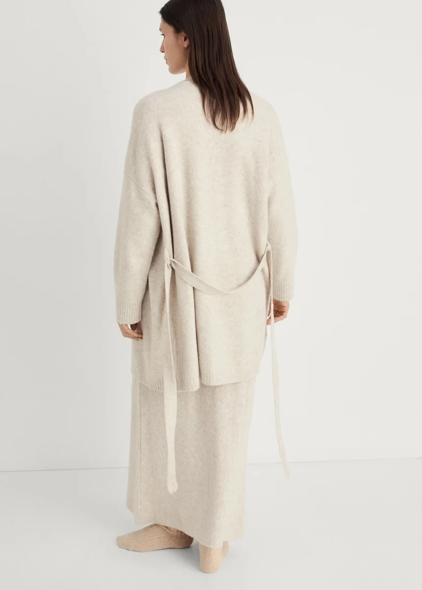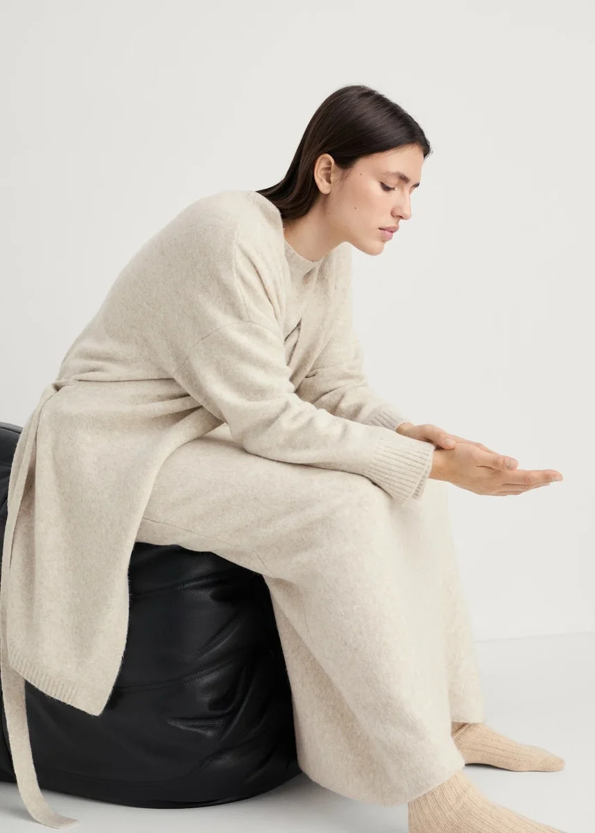 Midpoint. Modello midi. Scollo a V incrociato. Maniche lunghe. Cintura decorativa. Maglione, gonna e pantaloni abbinati. Total look.