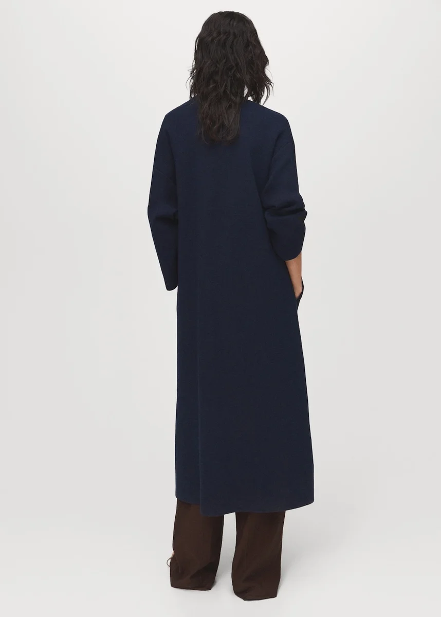 Tessuto lavorato a maglia. Modello lungo. Collo con revers a V. Maniche lunghe. Due tasche laterali. Senza chiusura.