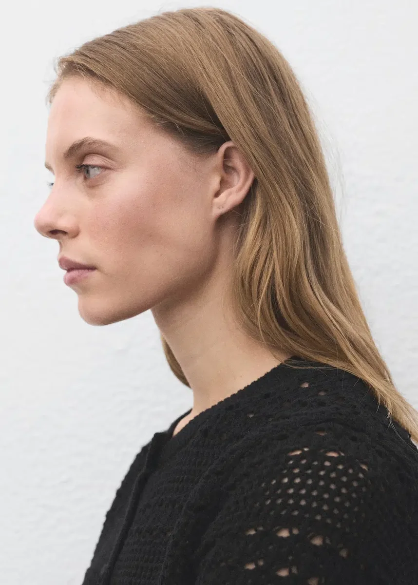 Realizzato in maglia con lavorazione all’uncinetto, questo capo presenta un taglio dritto con scollo rotondo e maniche corte. Chiusura con bottoni sul davanti. Completa il total look con gli shorts abbinati