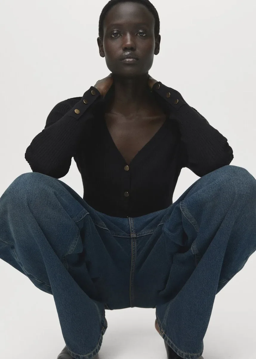 Realizzato in maglia a coste sottili, questo capo presenta un elegante scollo a V e maniche lunghe. La chiusura frontale con bottoni aggiunge funzionalità e stile