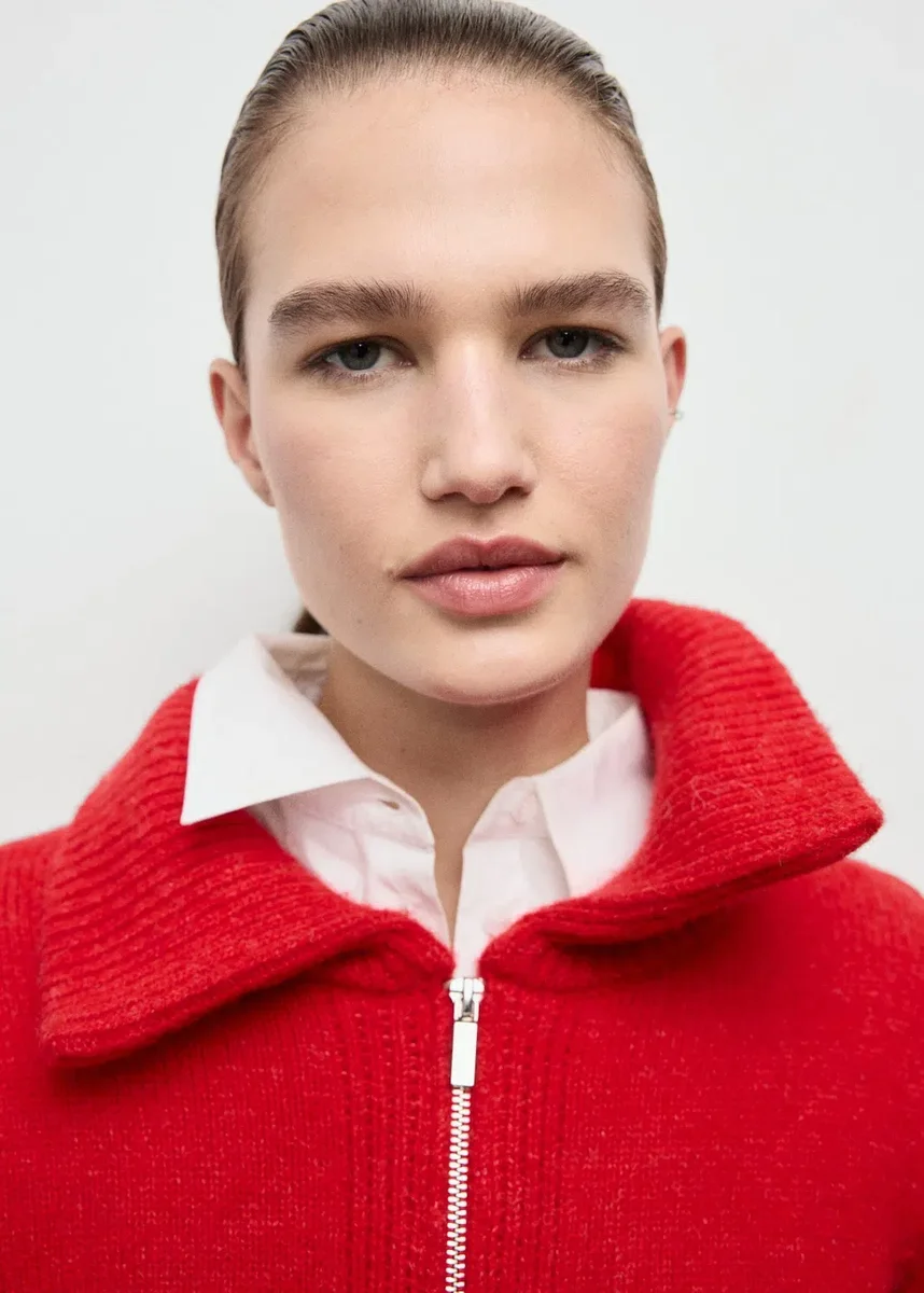 Maglia grossa. Design dritto. Colletto camicia. Maniche lunghe. Chiusura con zip a doppio cursore.