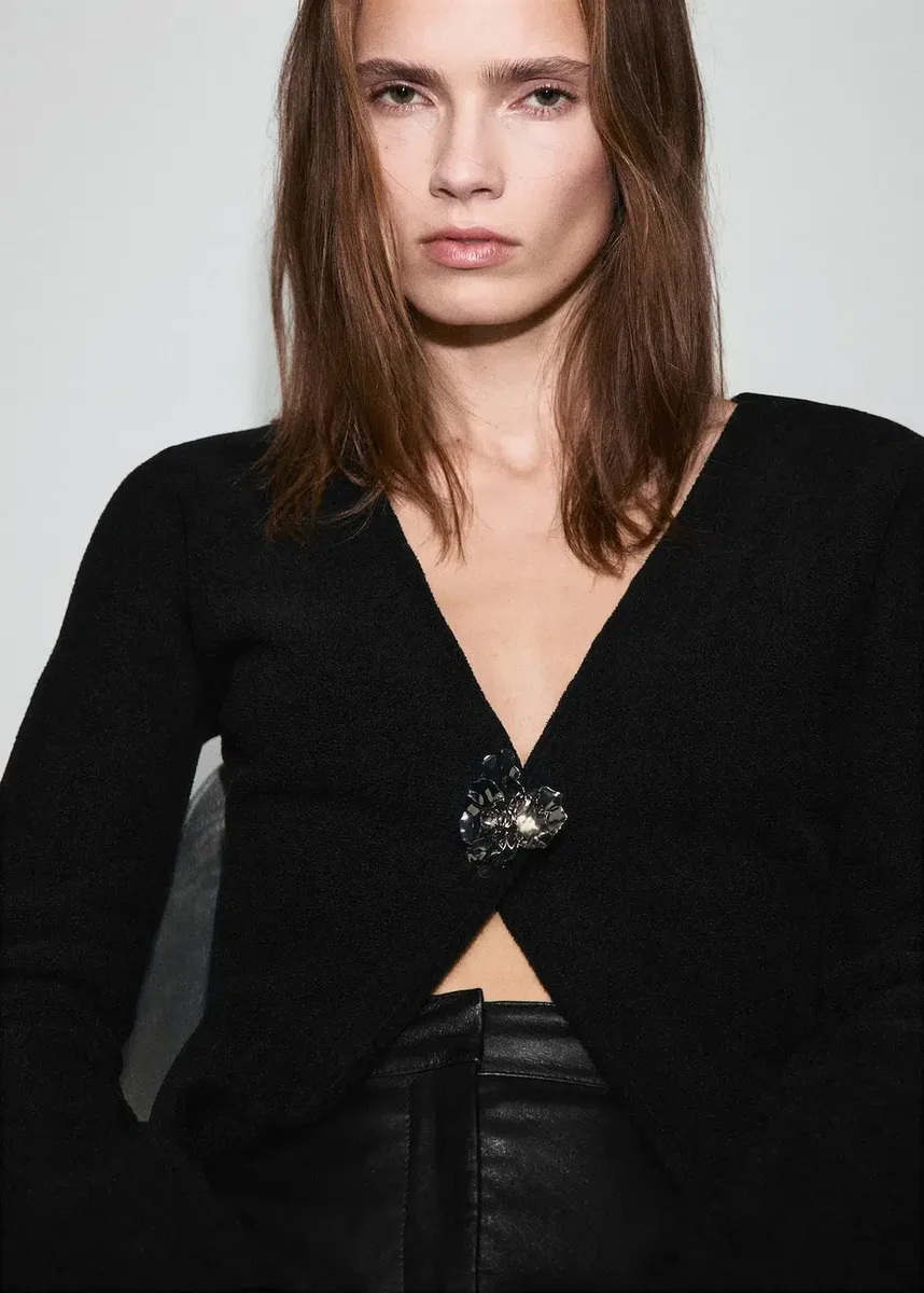 Tessuto a maglia. Vestibilità aderente. Scollo a V. Maniche lunghe. Bottoni effetto gioiello. Chiusura frontale con bottoni. Questo capo fa parte della nostra collezione per feste ed eventi, pensata per valorizzare il tuo look nelle occasioni speciali.