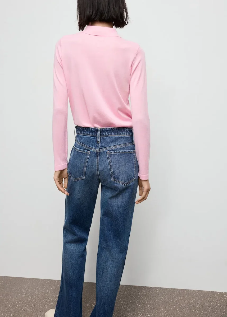 Maglia fine. Taglio dritto. Collo polo con chiusura a bottoni. Maniche lunghe.
