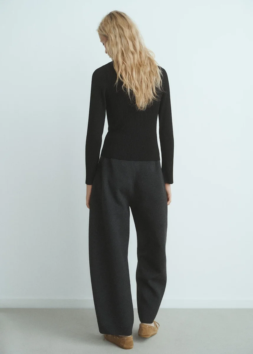 Maglia media. Maglia a costine. Taglio aderente. Collo camicia. Maniche lunghe. Bottoni gioiello. Senza chiusura.