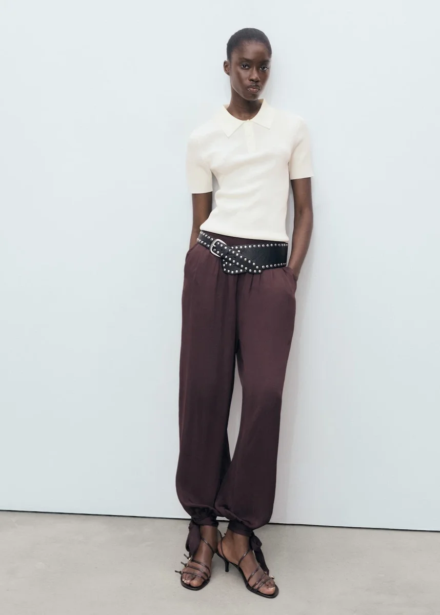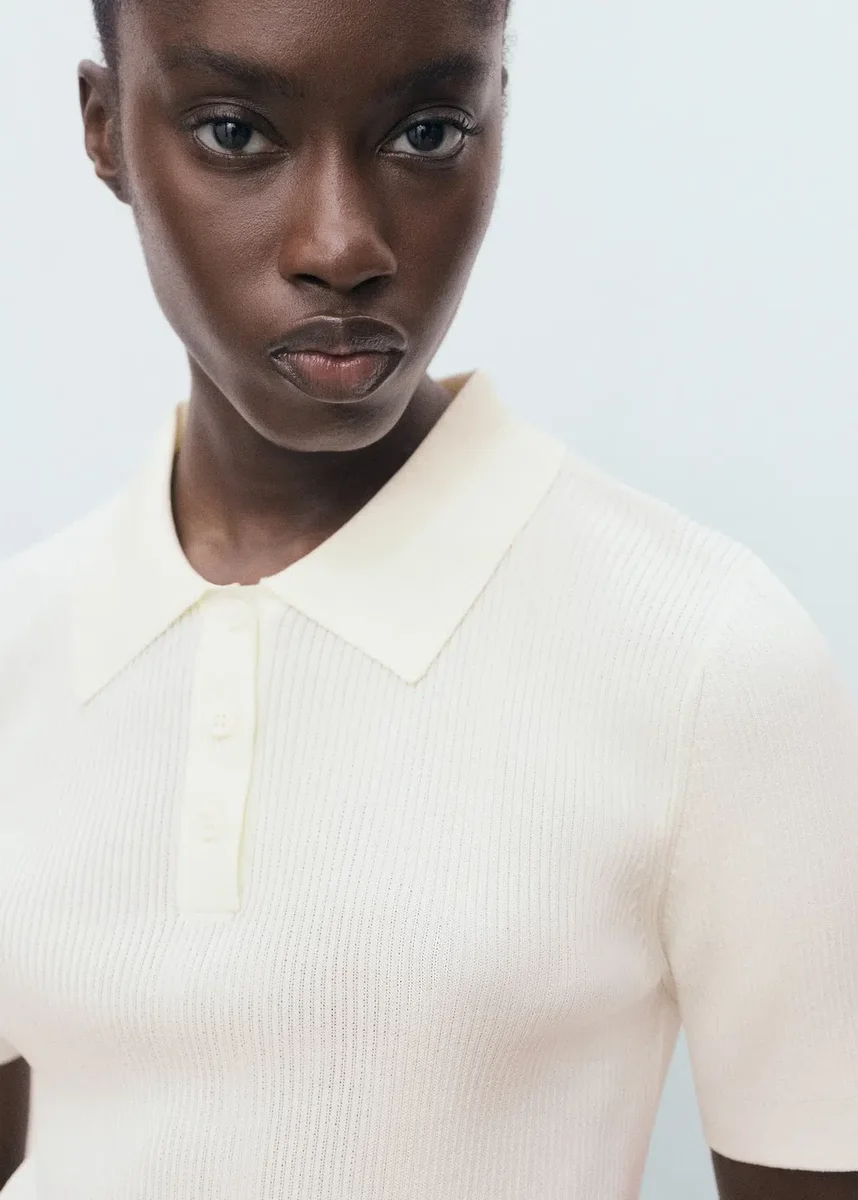Questo maglione presenta un tessuto a maglia fine con un design aderente. Presenta un collo stile polo e maniche corte, completate da una chiusura con bottoni sul collo. Disponibile in taglie forti