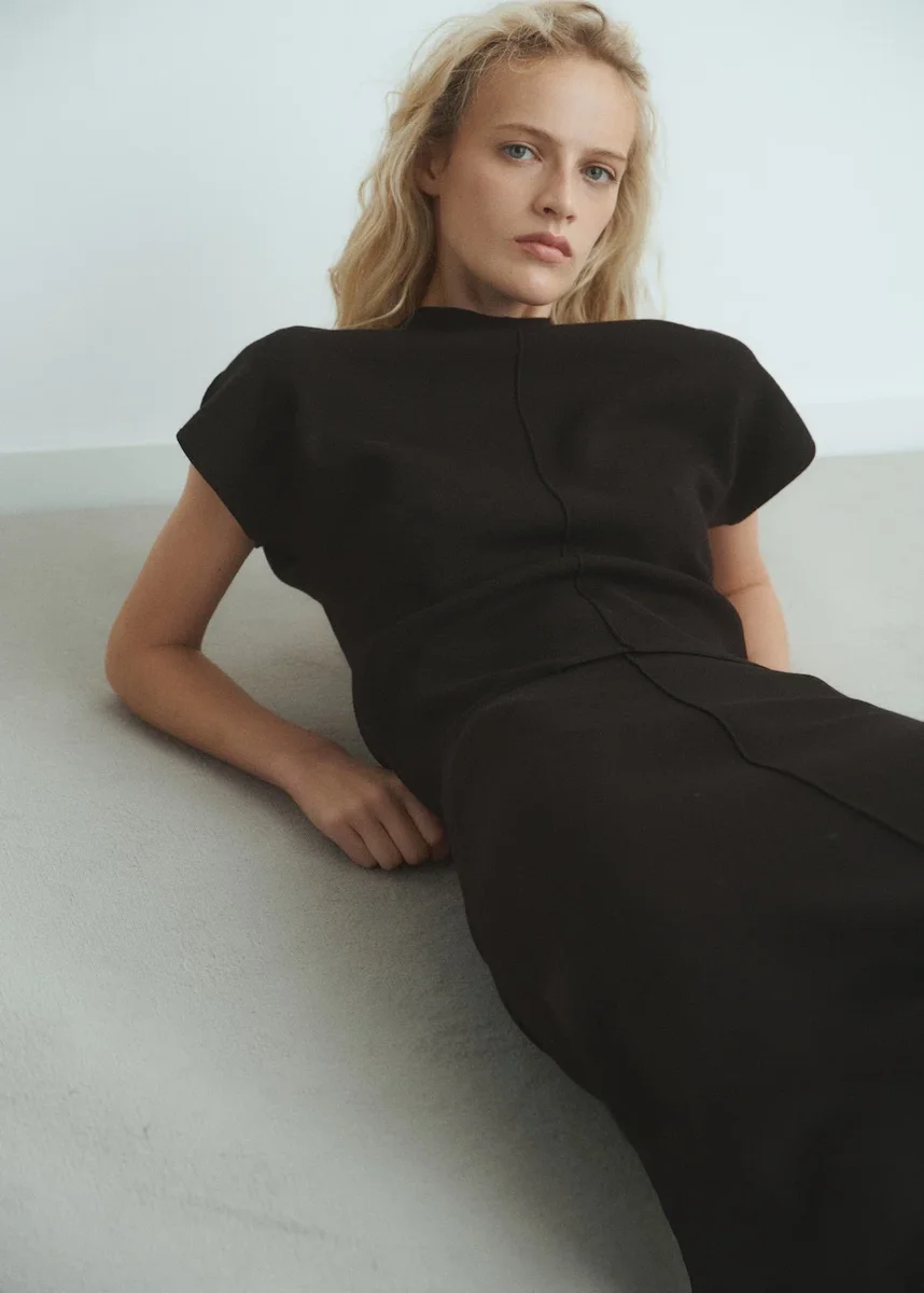 Realizzato in maglia fine, questo modello aderente presenta un collo rotondo e maniche corte. È abbinato a una gonna coordinata