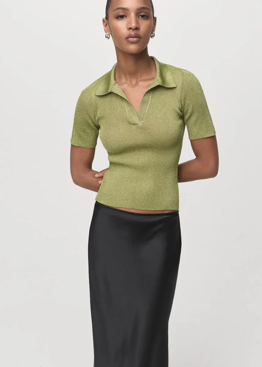 Realizzato in maglia fine con lurex, questo modello aderente presenta un collo polo con chiusura a bottoni e maniche corte