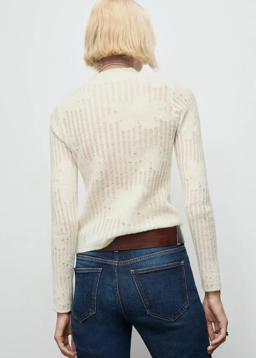 Realizzato in maglia traforata con dettagli floreali, questo modello dritto presenta un collo Perkins e maniche lunghe