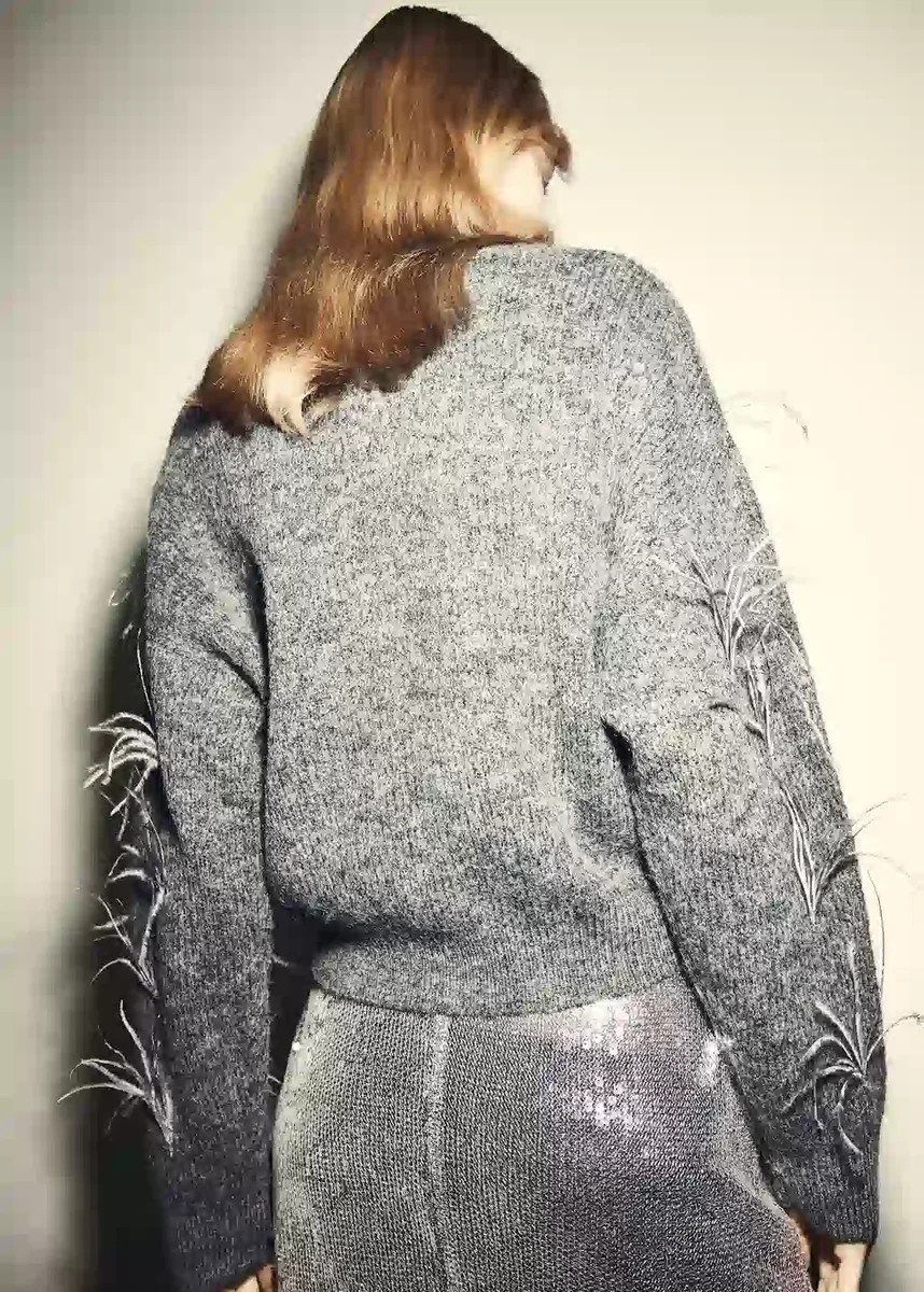 Realizzato in maglia media, questo modello dritto presenta un collo a scatola e maniche lunghe, impreziosite da piume di struzzo
