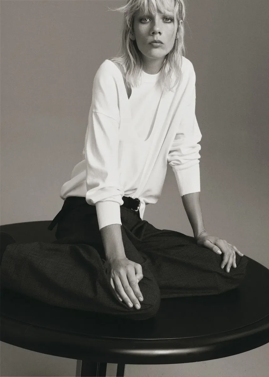 Tessuto a maglia fine. Modello oversize. Design combinato. Scollo rotondo. Maniche lunghe.