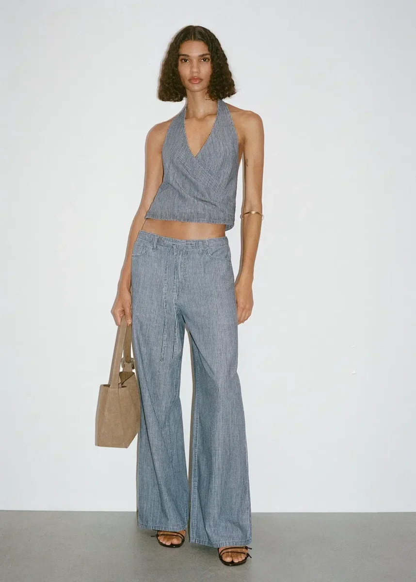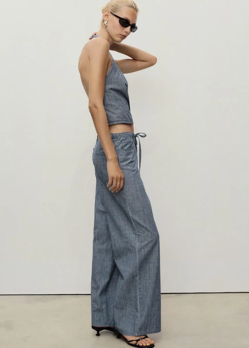 Tessuto denim di cotone. Modello lungo. Modello a gamba larga. Modello a righe. Vita media. Passanti per cintura. Cintura regolabile. Cinque tasche. Chiusura con gancio e zip. Fodera interna. Lunghezza interna 79,5 cm